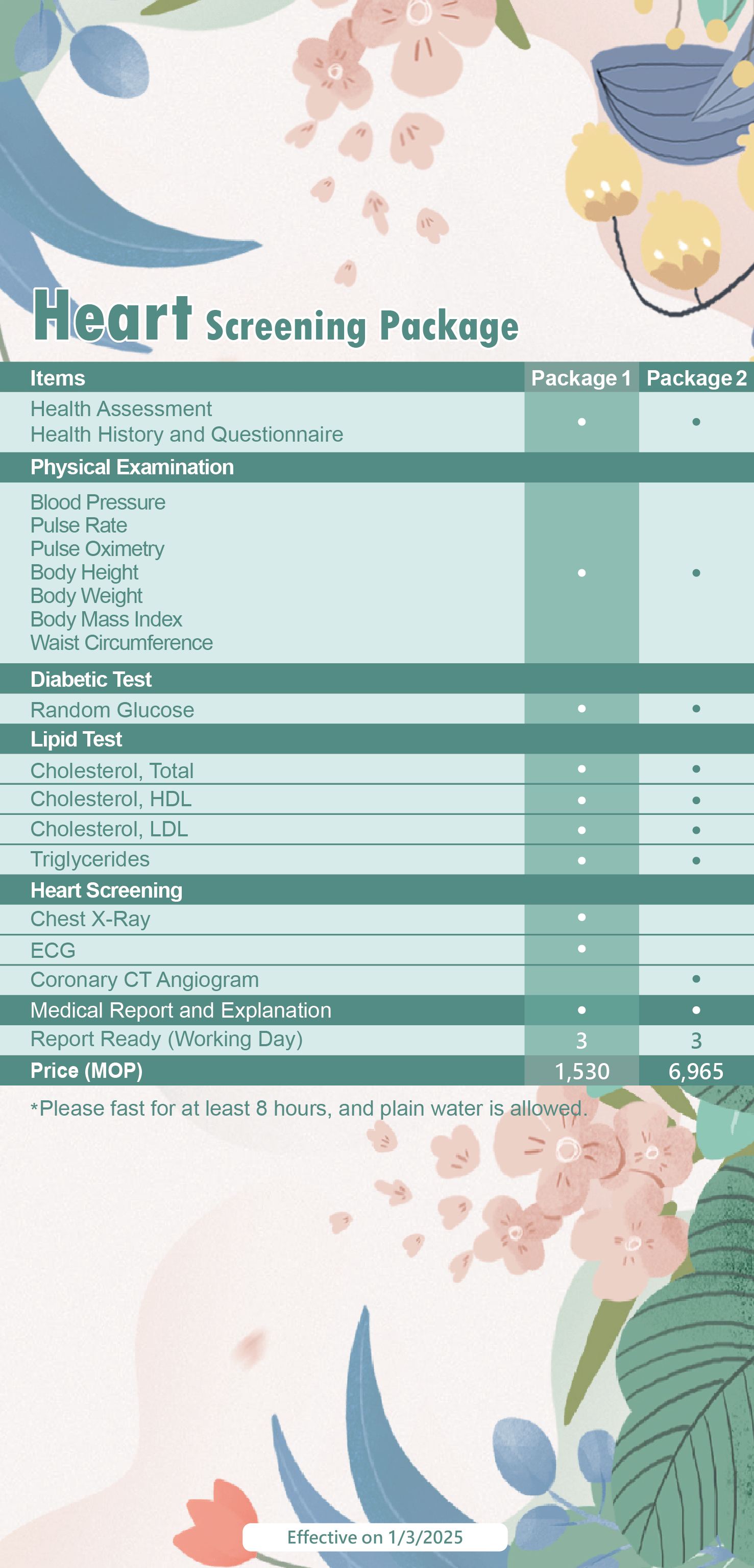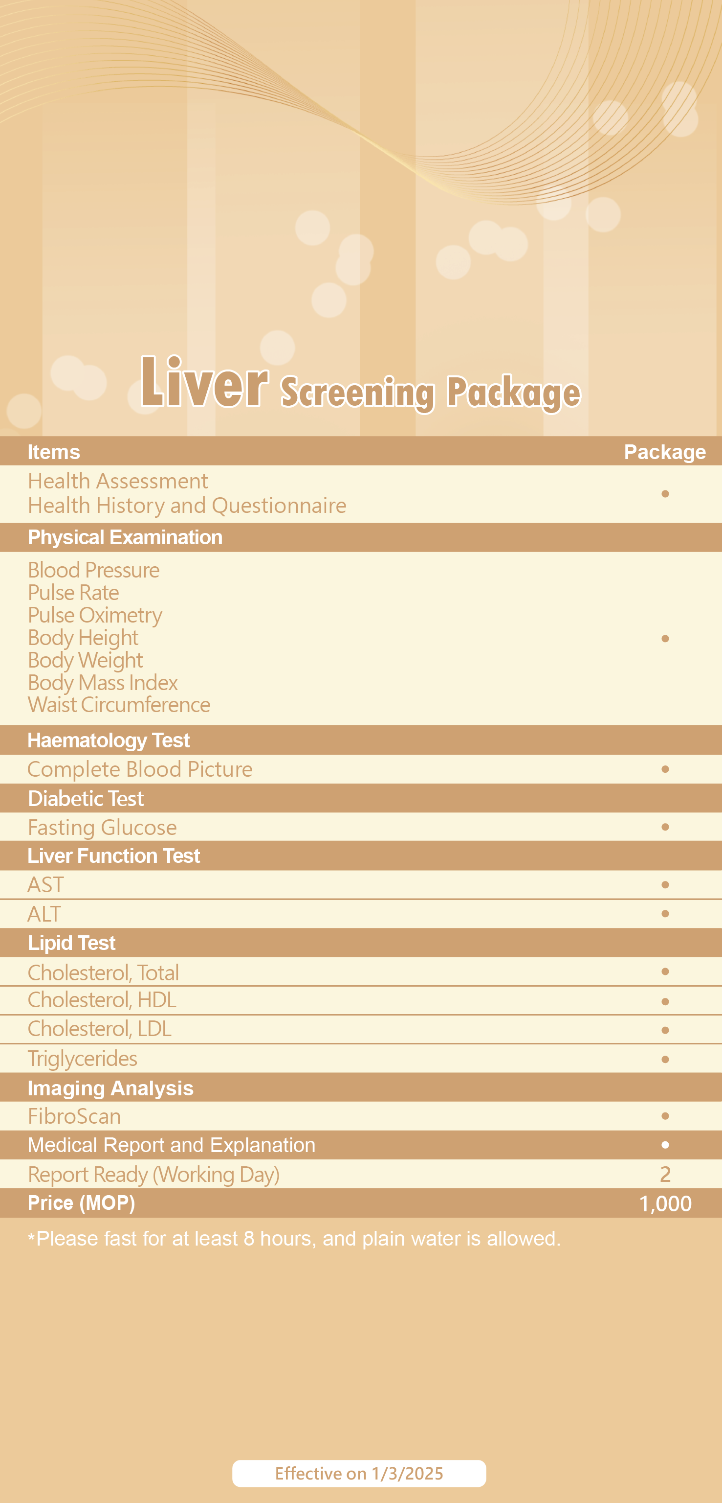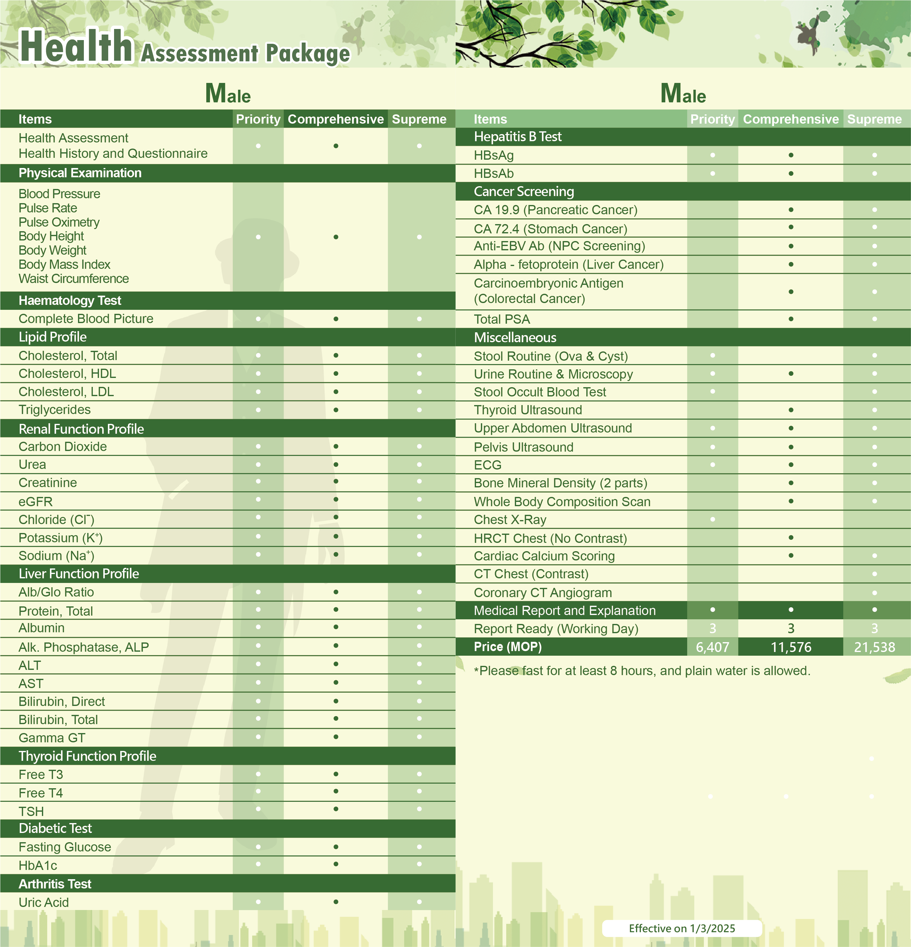 The three major Health Assessment Packages (Priority, Comprehensive, and Supreme), Heart and Liver Assessment Package, fasting for at least 8 hours is required, during which plain water may be consumed in moderation. Other Health Assessment Packages do not require fasting.