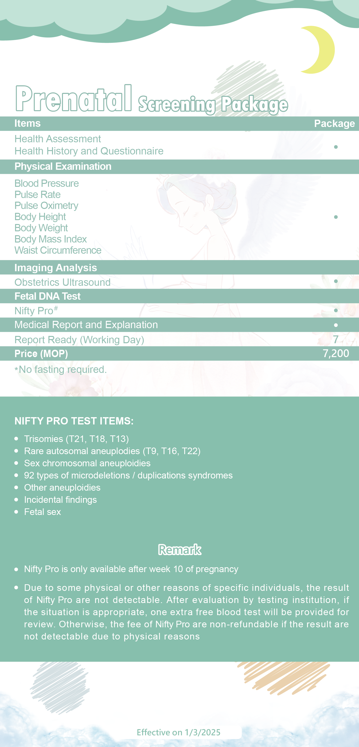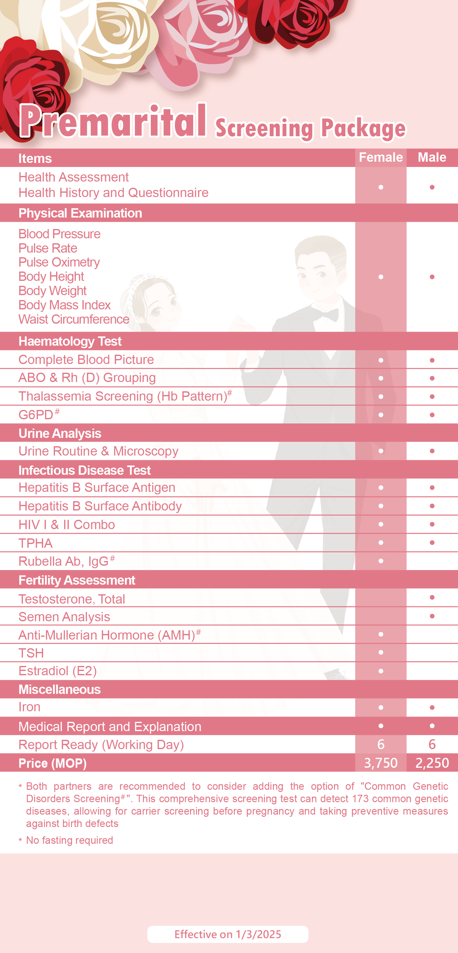 - X-Ray and Pap Smear examination are not recommended if you currently confirmed or suspected pregnant and planning to get pregnant, please inform our staff early.
