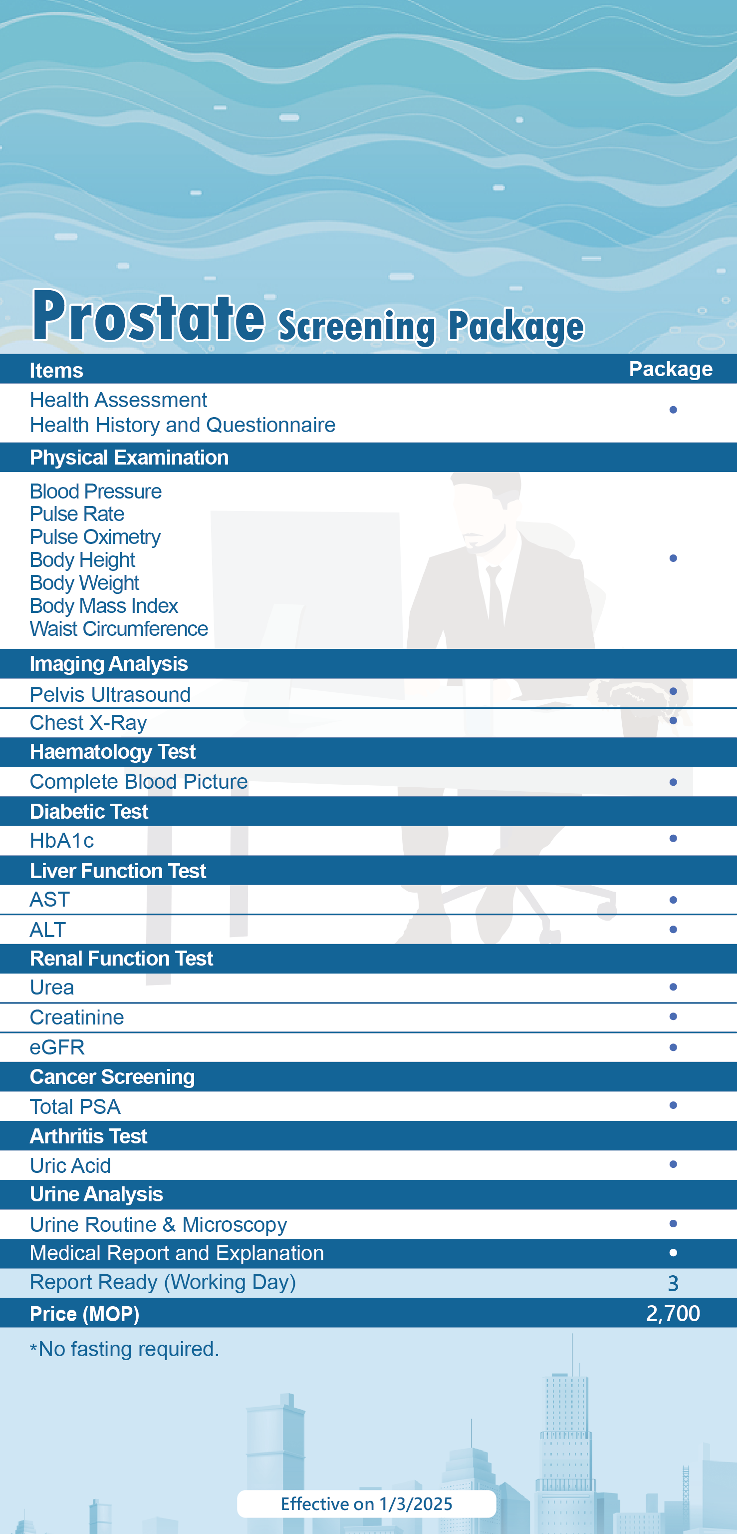 - Maintain a regular diet three days before examination, please ensure regular meal on time, no alcohol, no excessive smoking and avoid any strenuous exercise. Avoid consume any medication that will affect renal and liver function.