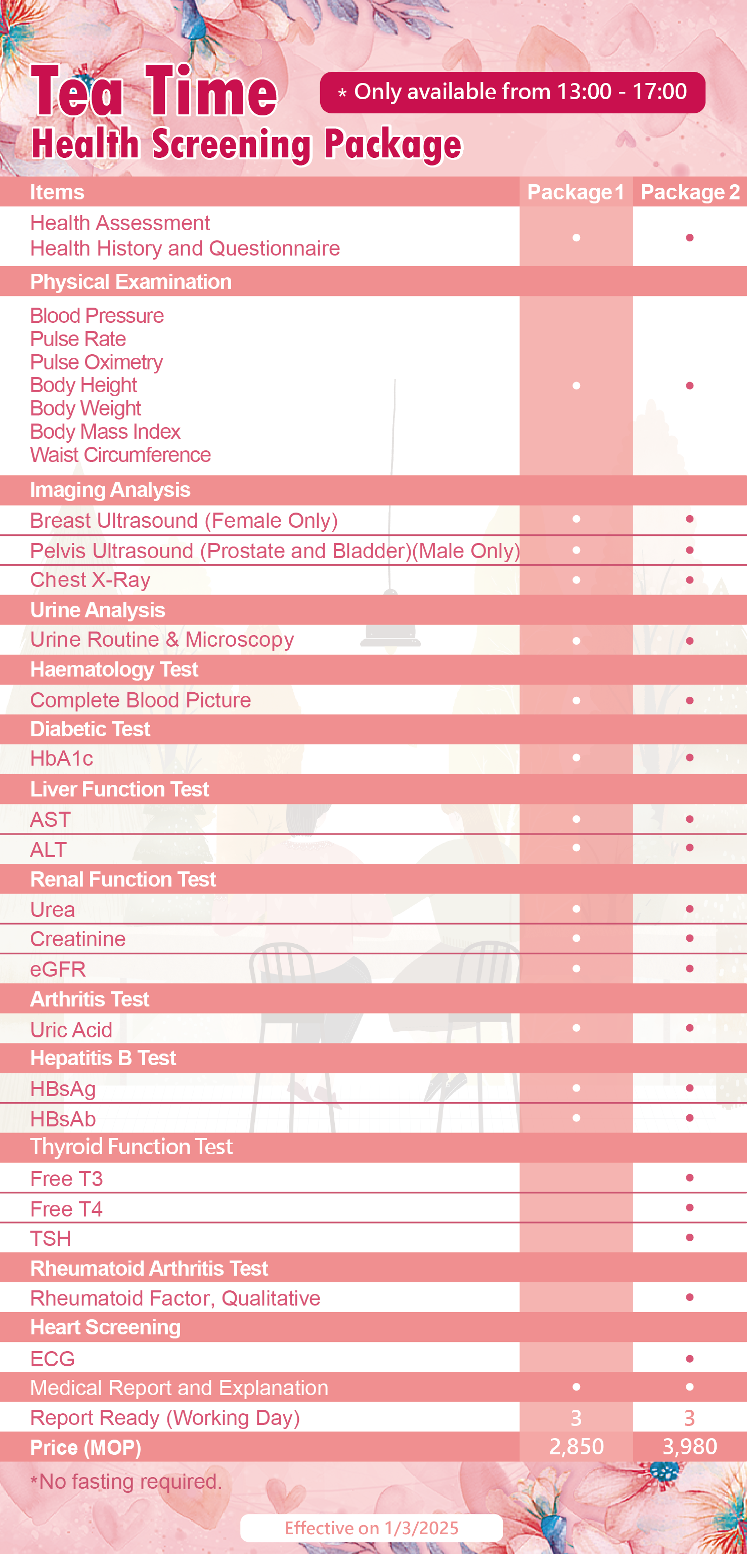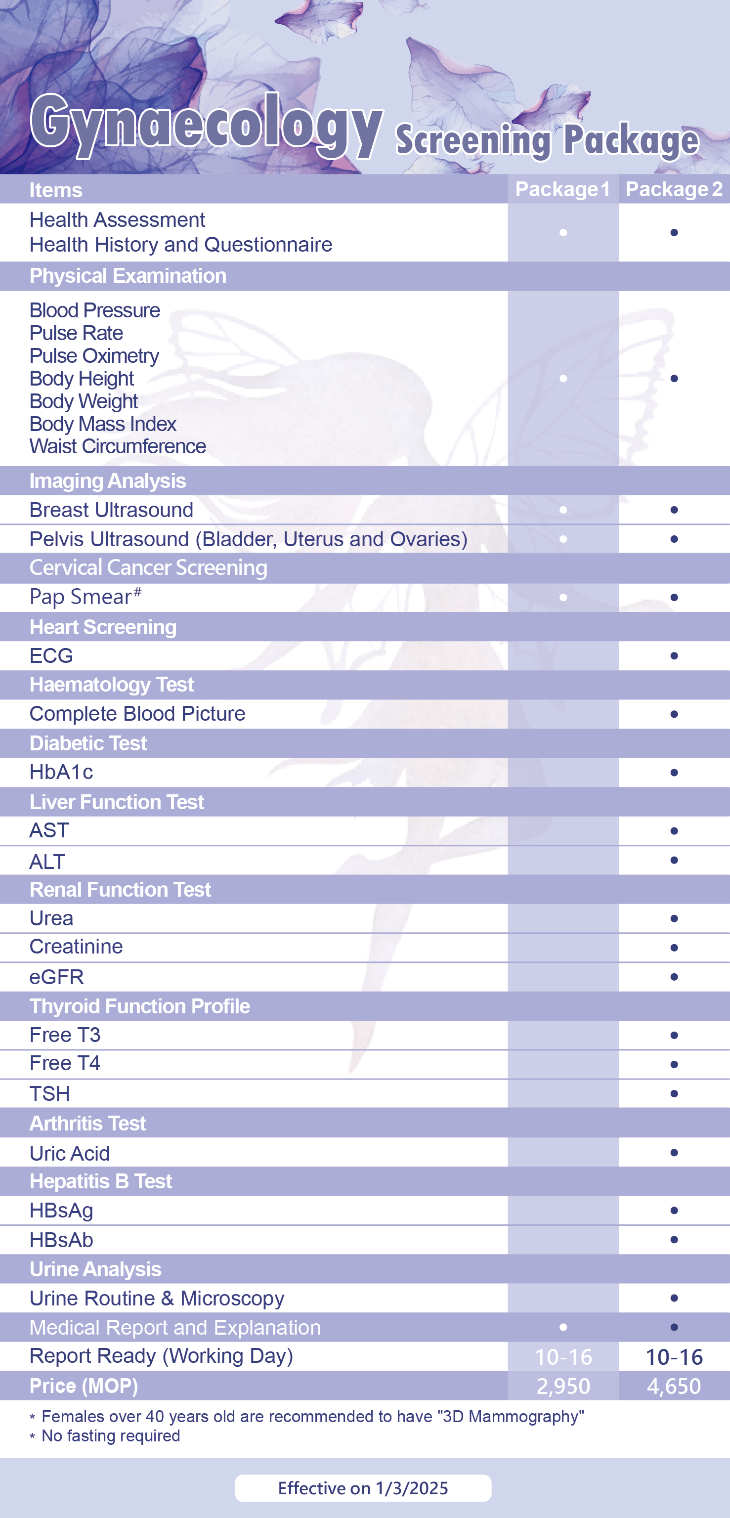 - Breast, Pelvis Ultrasound and Pap Smear are recommended to perform at least one week after completed your menstruation cycle; sexual intercourse activity shall be avoided on a day before Pap Smear examination.