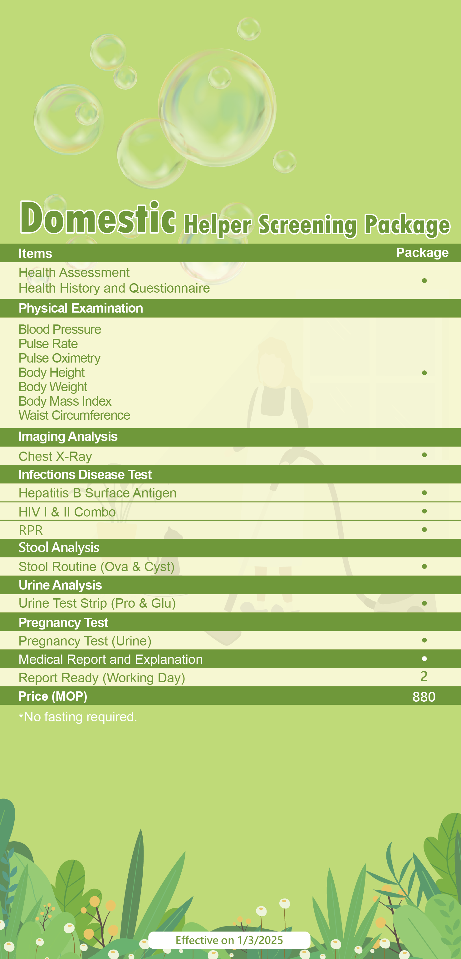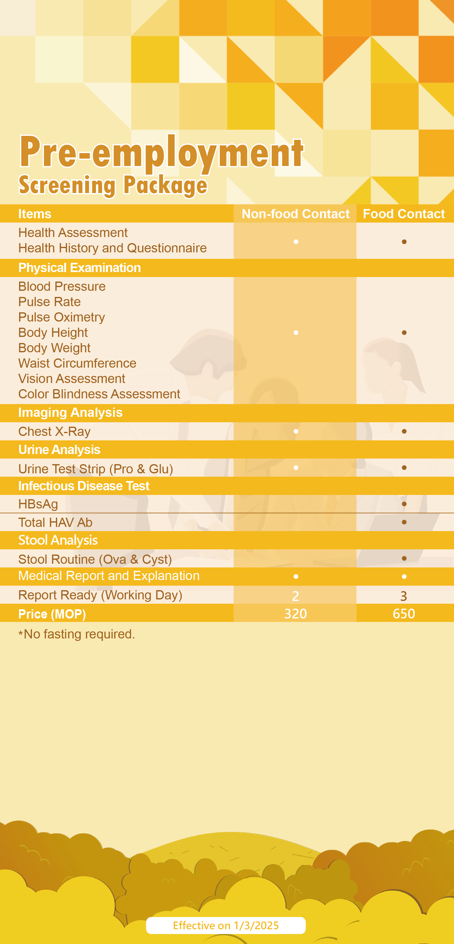 - Patients with chronic diseases such as Diabetes, Hypertension, Heart Disease, Asthma, etc. should bring their daily medications on the day of medical examination. Usual medications can be taken on the day of medical examination and please inform our doctor for reference.