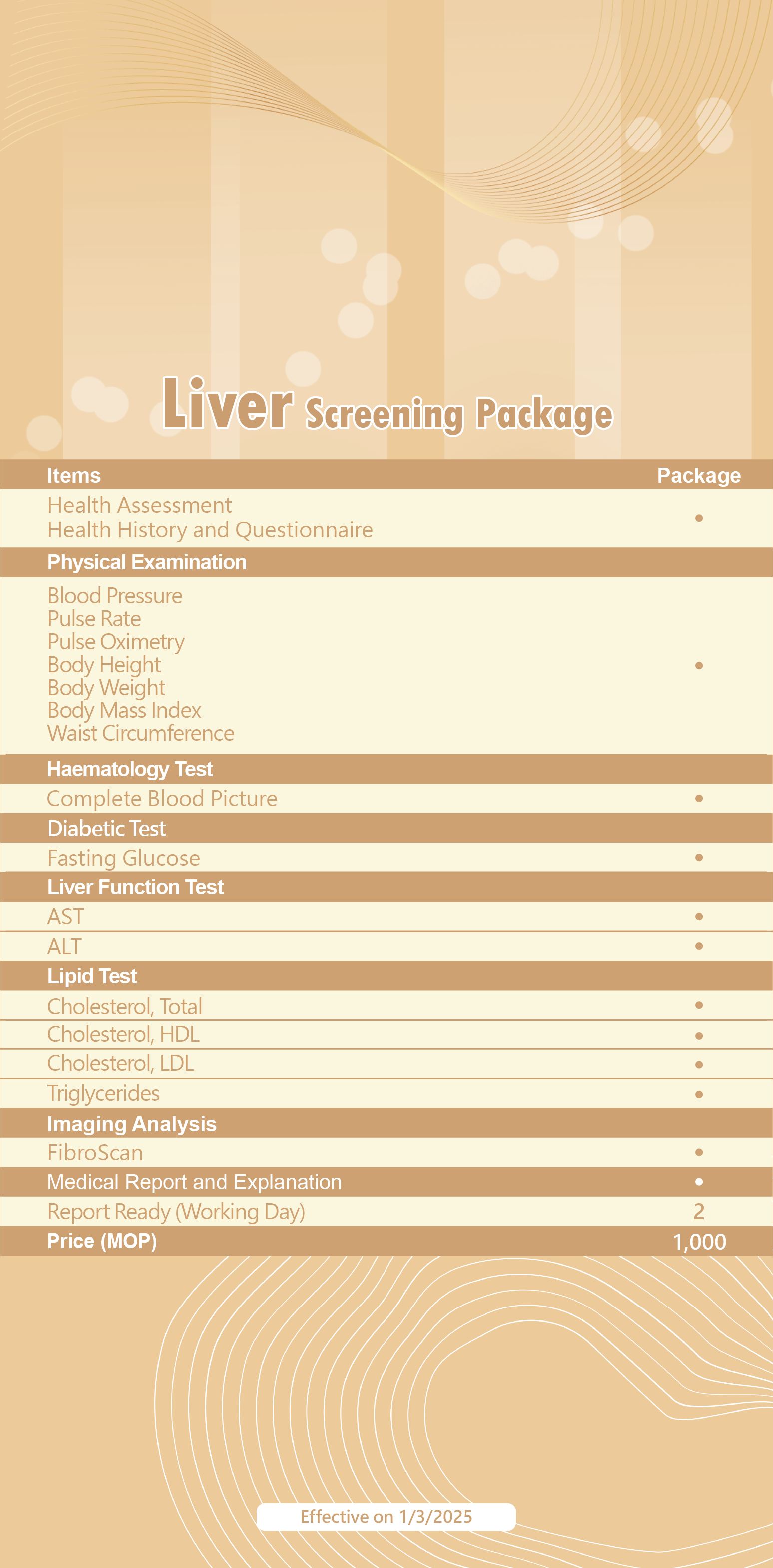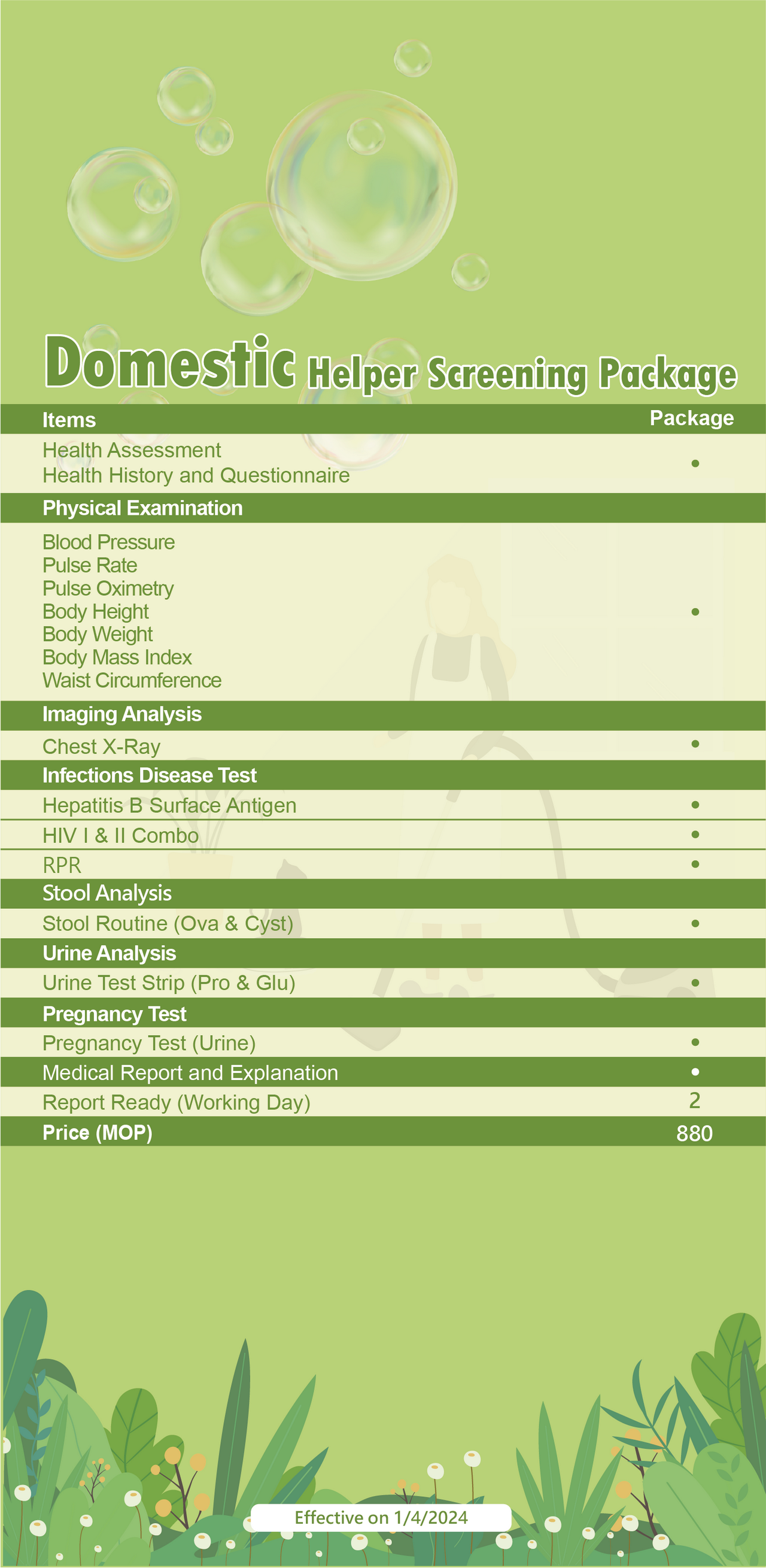 The health assessment service is made up of family doctors, caregivers and technicians. In addition to physical health checks, it provides a series of diagnostic tests that are combined into a health assessment program to meet the needs of men and women of all ages and health helping them to lead a healthy and fulfilling life, including Female and Male Health Assessment, Premarital, Prenatal and Cancer Screening Package, etc.
