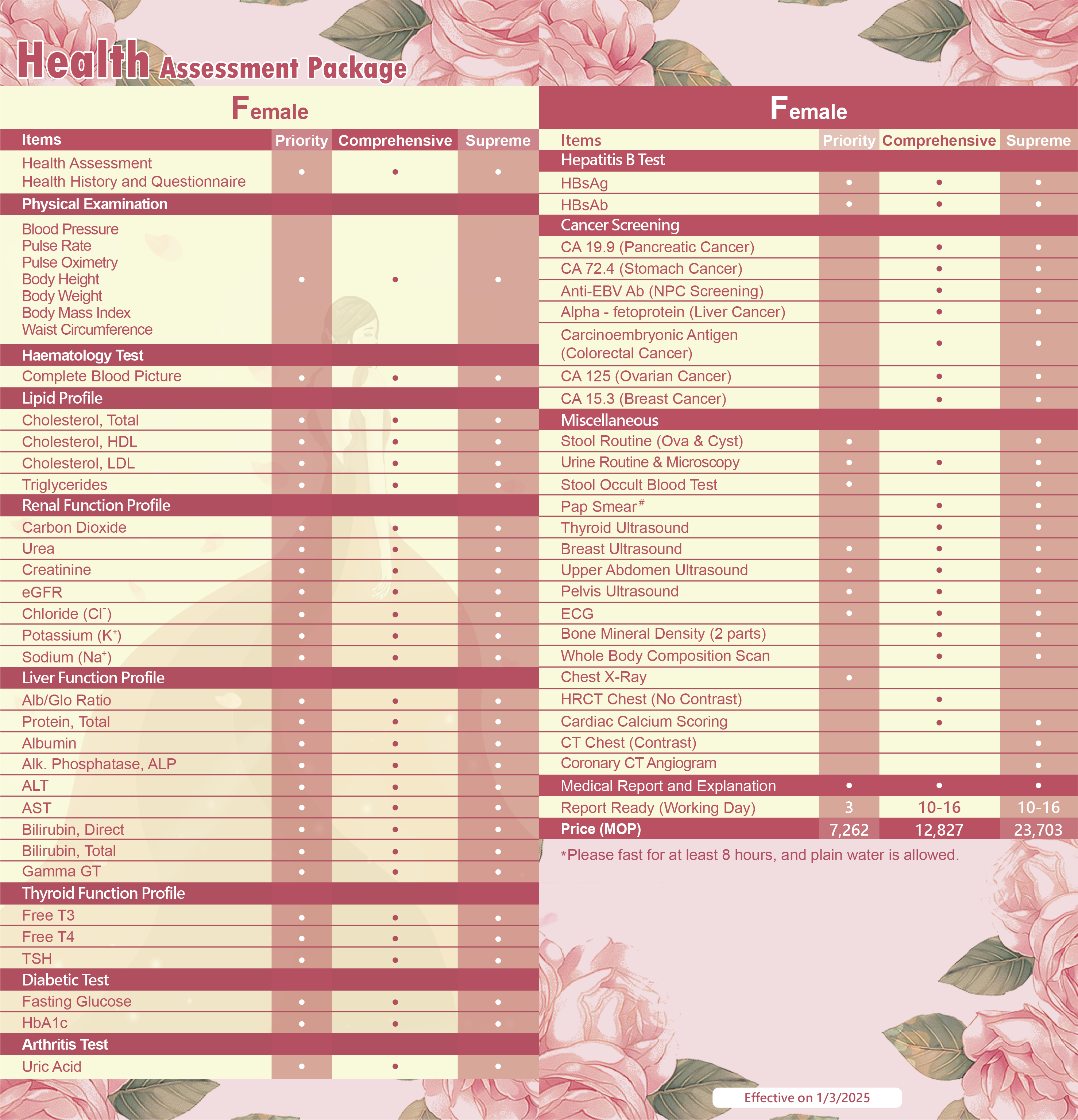 - Breast, Pelvis Ultrasound and Pap Smear are recommended to perform at least one week after completed your menstruation cycle; sexual intercourse activity shall be avoided on a day before Pap Smear examination.