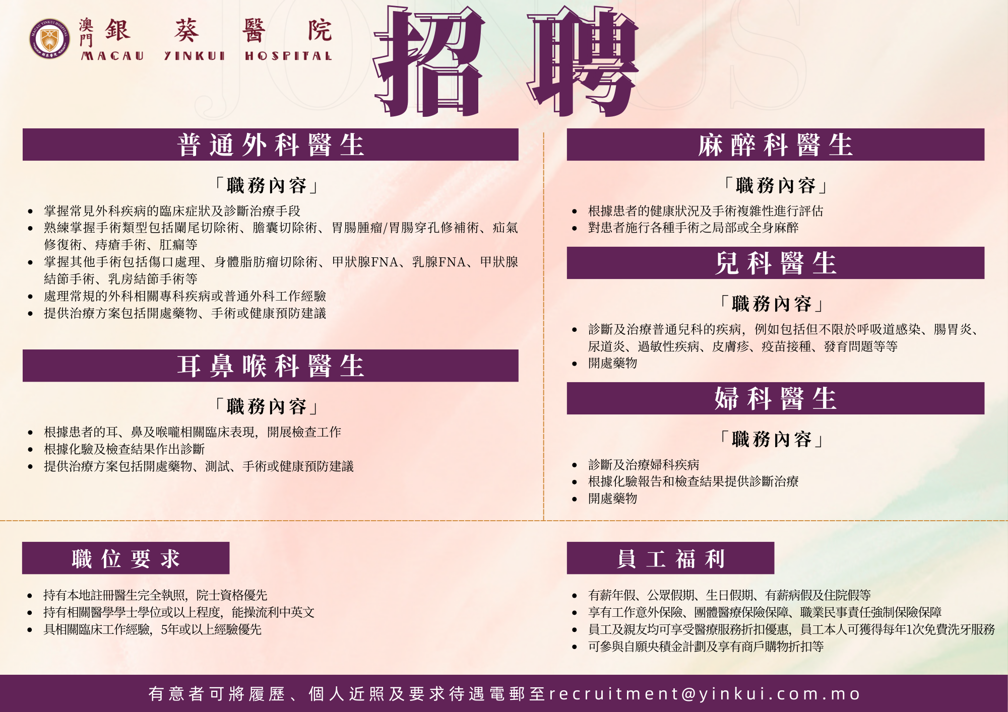 本院提供多個職位,並提供優厚待遇及多種福利予合適的應聘者,如對本院的職位有興趣者,請將您的個人履歷、應聘職位、相關文件及要求待遇電郵至Email住址會使用灌水程式保護機制。你需要啟動Javascript才能觀看它。